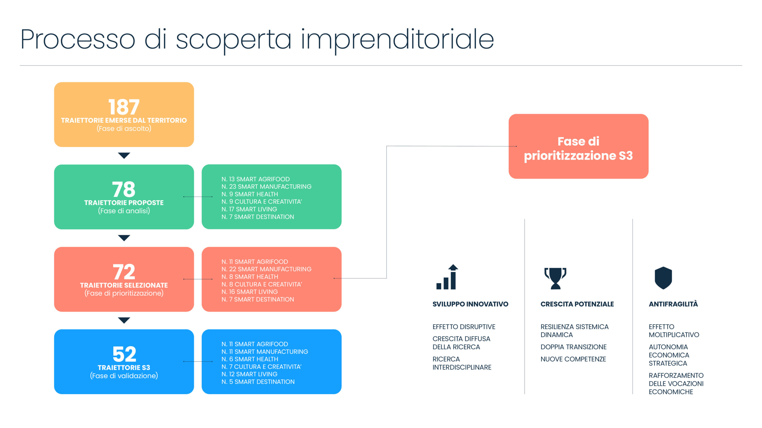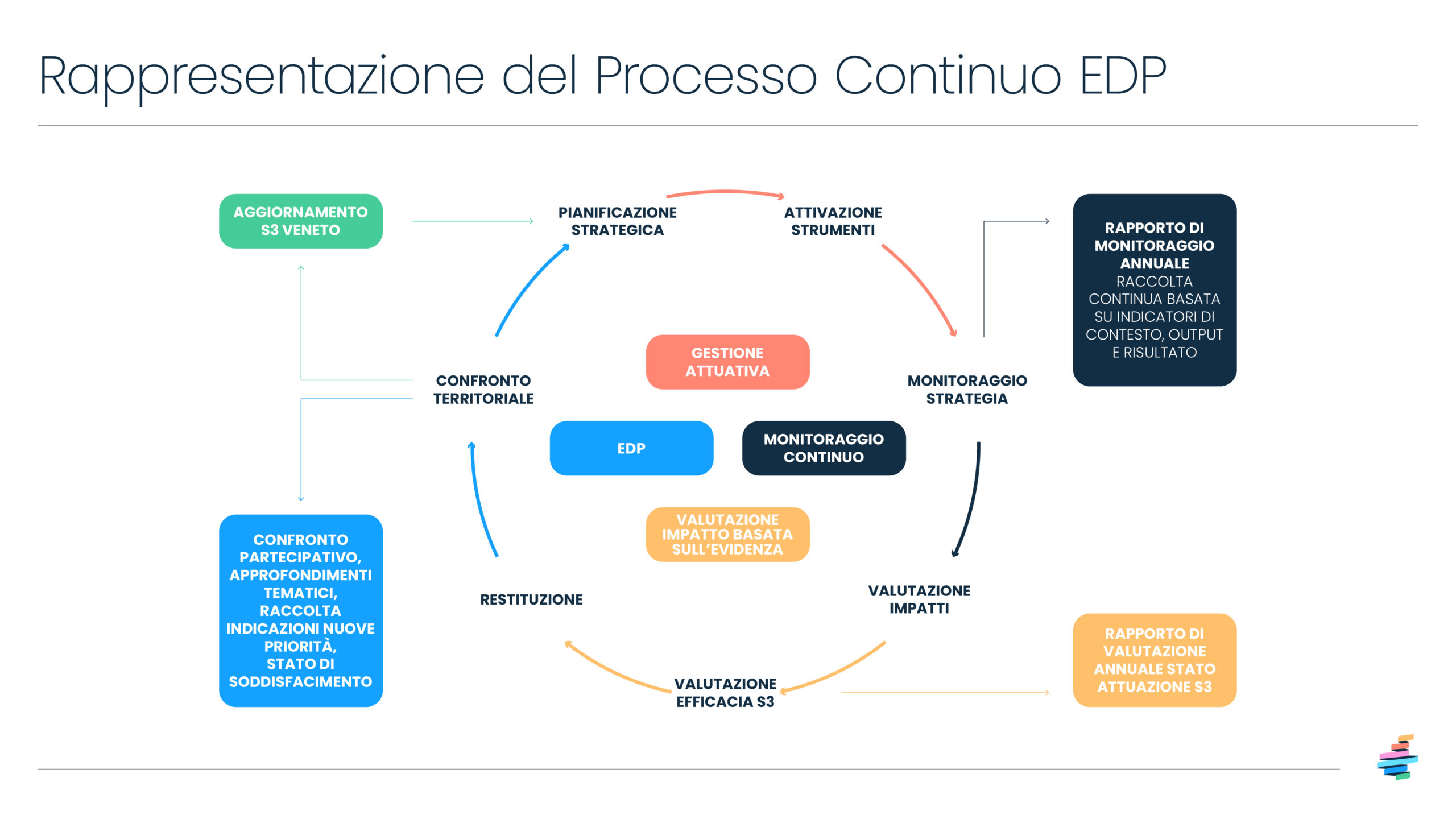 Il processo di Scoperta Imprenditoriale (EDP), che è stato fondamentale nella definizione della S3 2021-2027, è di fatto un processo continuo che punta a monitorare, arricchire e meglio declinare gli aspetti operativi al fine di mantenere efficace e antifragile la strategia stessa. Le attività di ascolto e confronto con il territorio hanno dunque lo scopo di mantenere animata la Strategia approfondendone le tematiche, raccogliendo critiche e proposte di miglioramento, proponendo sinergie con altri strumenti di politiche (regionali, nazionali e comunitari), restituendo le valutazioni di impatto e, più in generale, verificandone lo stato di soddisfacimento presso il territorio.