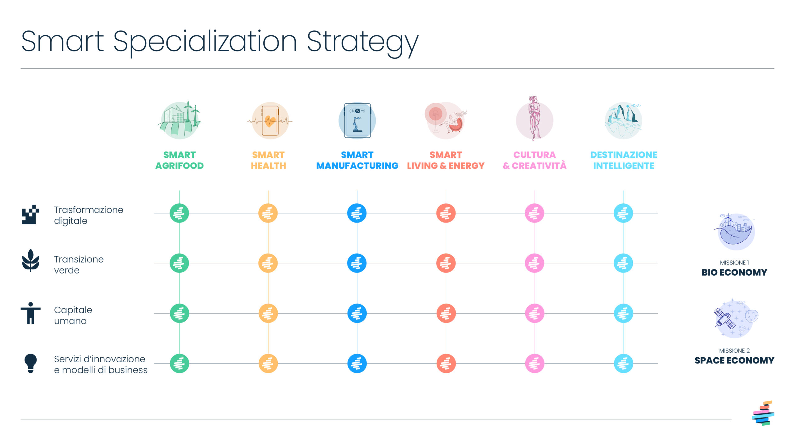 La Strategia di Specializzazione Intelligente è lo strumento che dal 2014 le Regioni ed i paesi membri dell’Unione Europea devono adottare per individuare obiettivi, priorità, azioni in grado di massimizzare gli effetti degli investimenti in ricerca e innovazione, puntando a concentrare le risorse sugli ambiti di specializzazione caratteristici di ogni territorio.