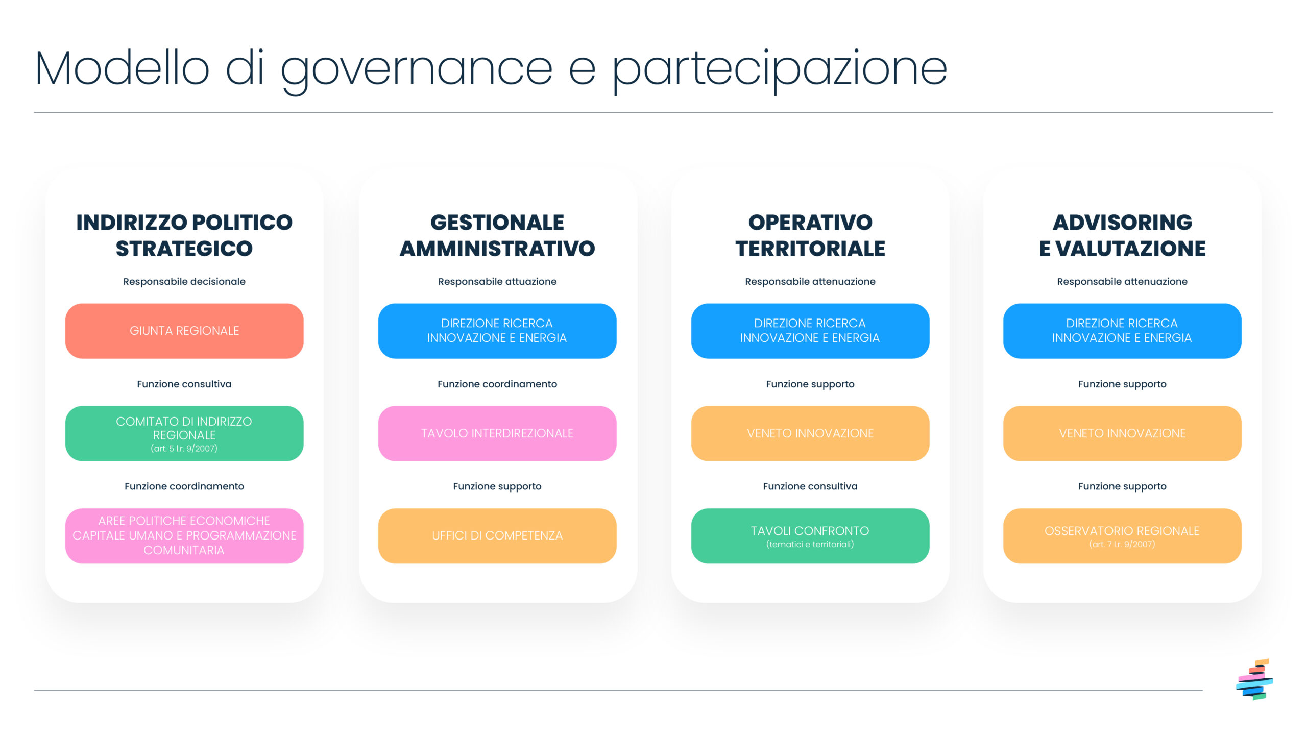 La Strategia S3 prevede anche un articolato sistema di governance che ne gestisce e monitora l’implementazione. Ciascun organo coinvolto dispone di compiti e funzioni specifiche per ottenere un processo partecipativo agile e orientato agli impatti territoriali, definendo in modo chiaro le funzioni e le responsabilità dei diversi soggetti coinvolti.